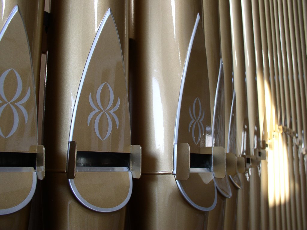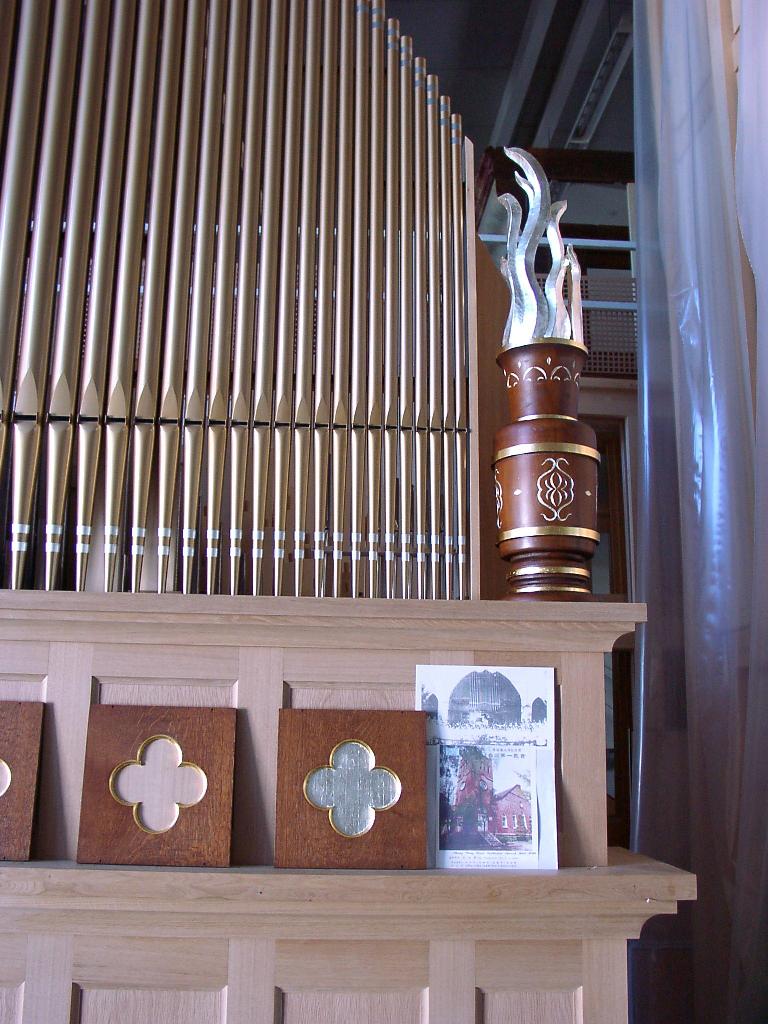 An beiden Seiten des Orgelprospektes stehen Skulpturen, die in einer ähnlichen (aber unbekannten) Form auch bei der ersten Orgel vorhanden waren. Auf dem alten Foto kann man diese erkennen. Wir haben einen Künstler beauftragt, diese Vasen mit Feuerflammen in freier Anlehnung an ähnliche Vorbilder aus dem Klassizismus herzustellen. Hiermit wollten wir dem Orgelprospekt einfach einen besonderen Schmuck geben. Die Kreuzform unter den Prospektpfeifen ist ebenfalls von dem alten Bild übernommen. Exakt diese Anordnung hatte auch schon die erste Orgel aus dem Jahr 1907.