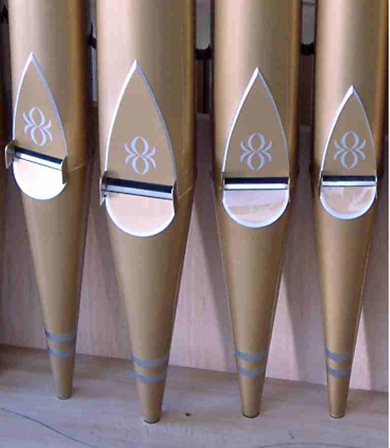 Die Prospektpfeifen kommen aus dem Register Principal 8′ des 1. Manuals (42 Pfeifen) sowie aus dem Register Choralbass 4′ des Pedals (30 Pfeifen). Es gibt keine Blindpfeifen (was für uns auch kein Problem bedeutet hätte). Allerdings haben die Pfeifen natürliche Überlängen, was unschwer am Prospektbild abzulesen ist. Die Prospektlegierung in diesem Fall war 82,5% Zinn, 15% Blei, 1,5% Kupfer und 1 % Antimon.